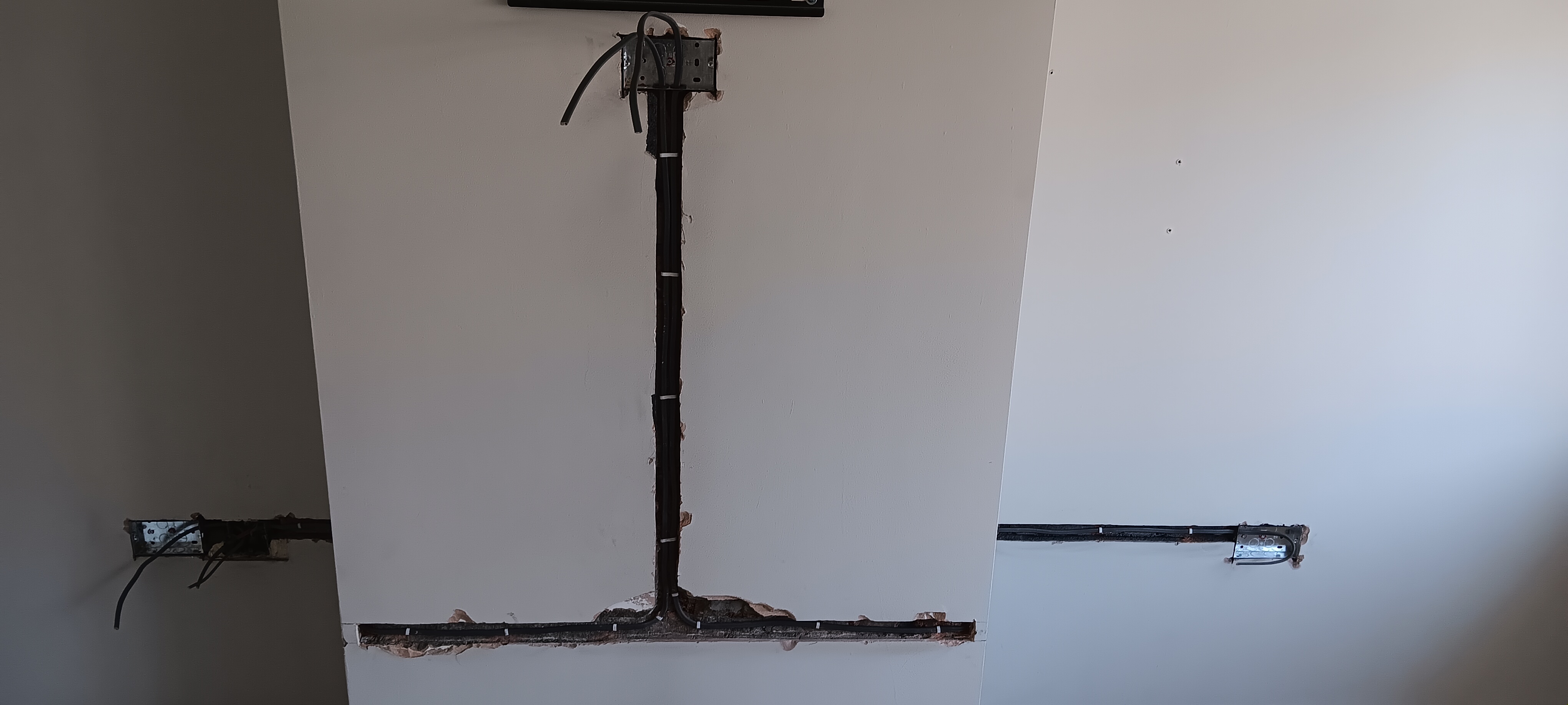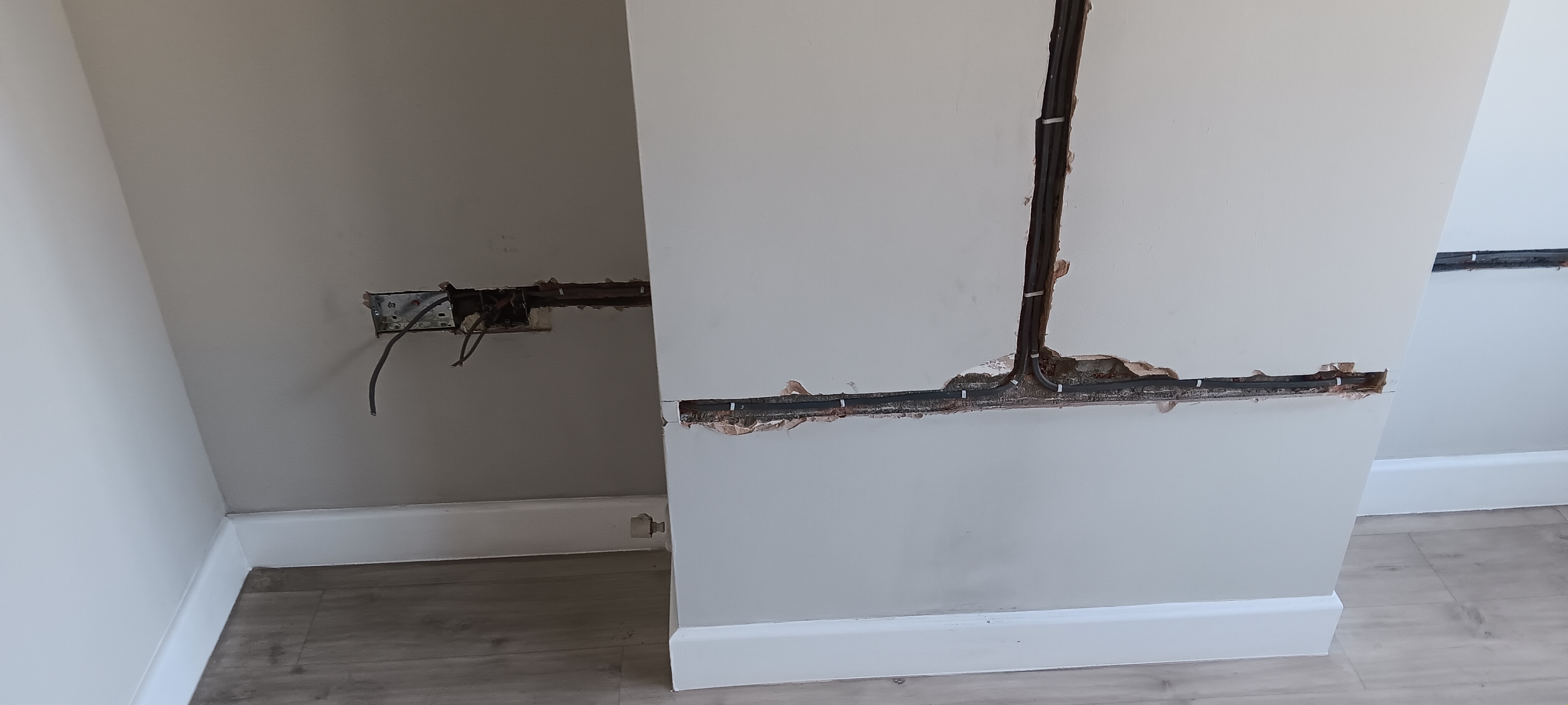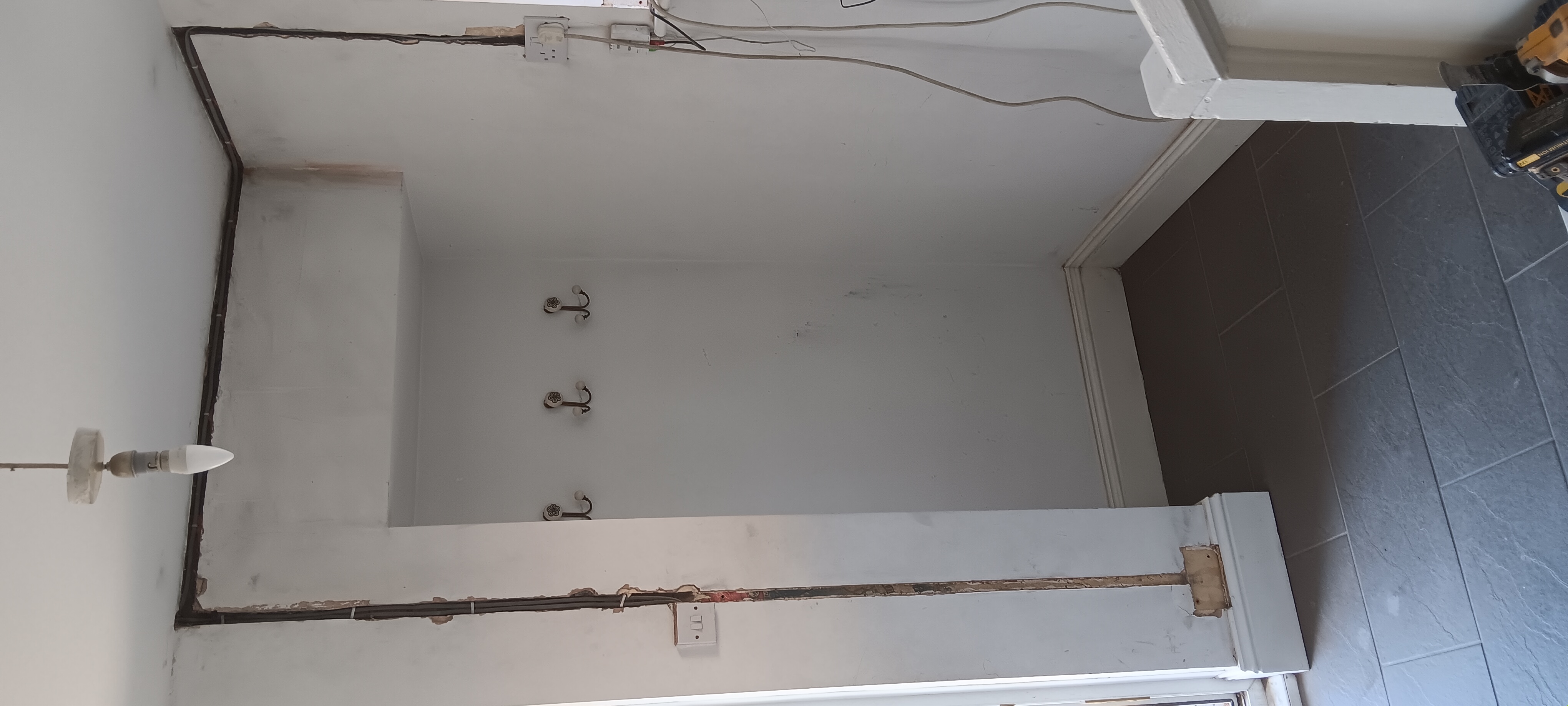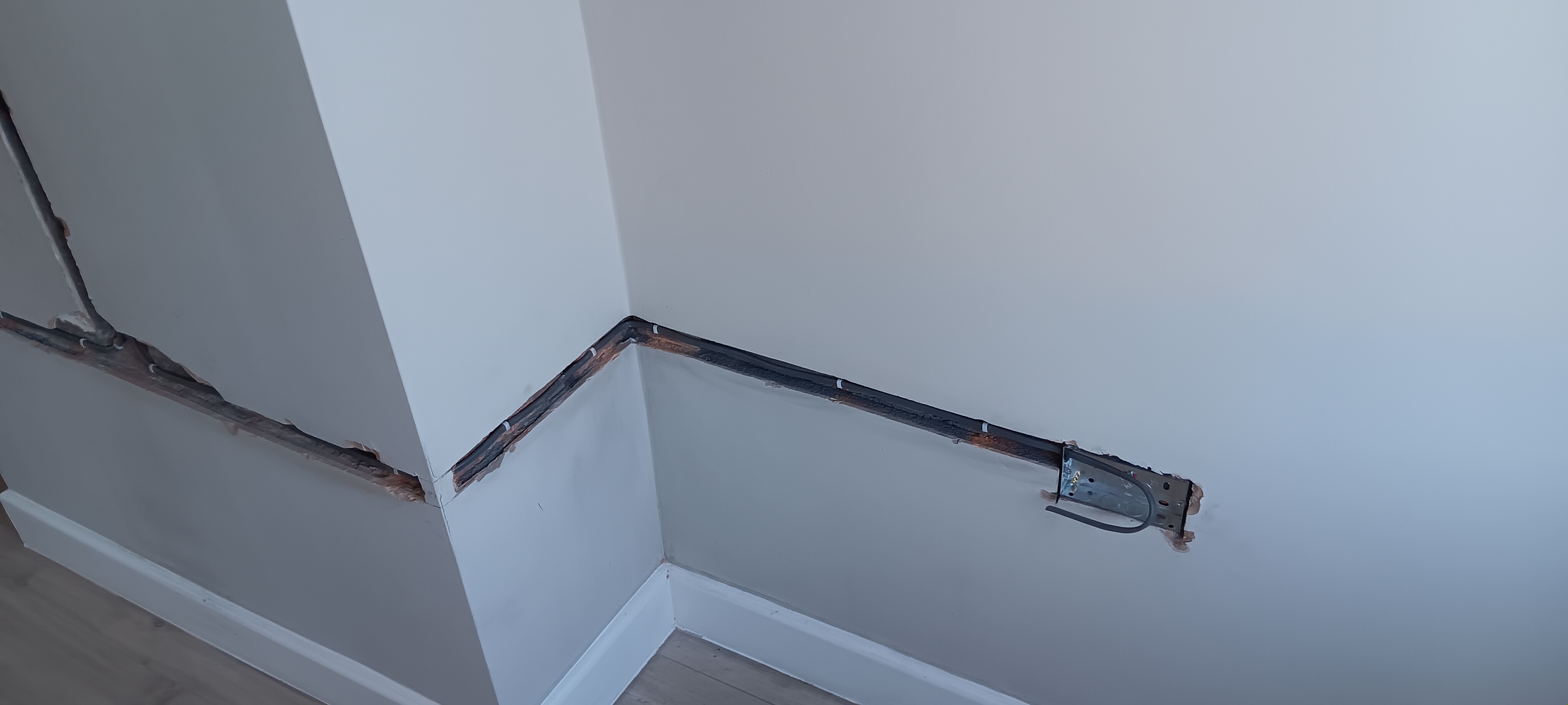 The electrical installation was fully modernised with concealed conduit, neatly chased walls and socket repositioning that met both functional and aesthetic expectations. The result is a clean, professional finish ready for plastering and decoration.